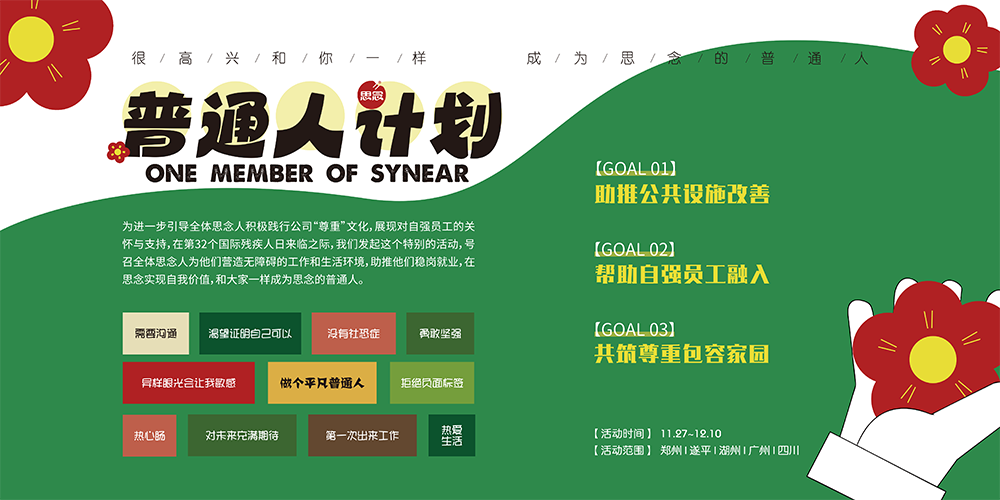 為進一步傳播針對自強員工的“尊重”文化,引導全體思念人積極踐行“尊重”文化,展現(xiàn)對自強員工的關(guān)懷與支持,在第32個國際殘疾人日來臨之際,思念食品組織開展了面向全國各生產(chǎn)基地的自強員工關(guān)愛活動,號召全體思念人為他們營造無障礙的工作和生活環(huán)境,助推他們穩(wěn)崗就業(yè),在思念實現(xiàn)自我價值,和大家一樣成為思念的普通人。